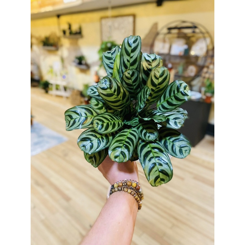 A tropical beauty with striking leaf patterns and a love for humidity. Calatheas move their leaves in response to light, making them feel alive and interactive.