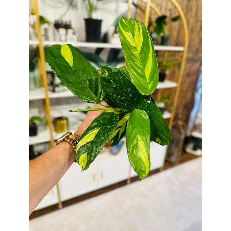 This stunning prayer plant features rounded, elongated leaves with striking green and yellow-toned patterns, creating a unique and vibrant display in any indoor setting.
