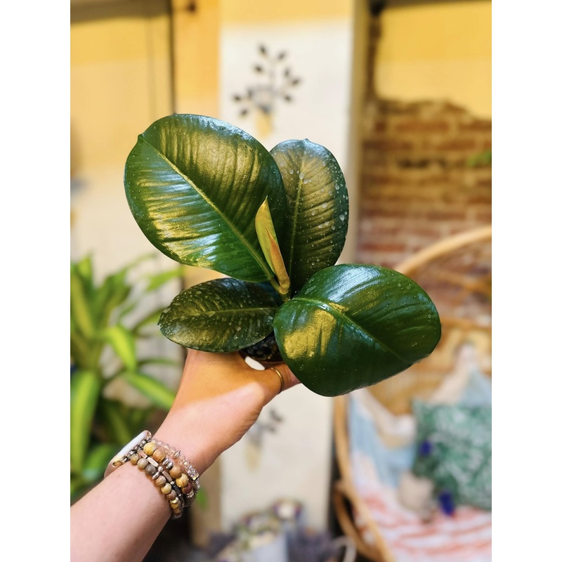 Ficus Sofia, also known as a rubber plant, is popular for its big dark green leaves. These ovate-shaped leaves are waxy and grow on a burgundy stem, making this Ficus plant a statement piece in your home or office. This plant likes bright, indirect light and will grow like a tree.