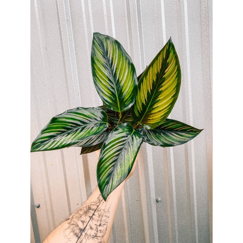 Calathea 'Beauty Star', or Prayer Plant, is knownfor its long, waxy, stripedleaves. Calatheas love high humidity and their soil moist. They're also known for their leaves curling up at night and unfurling in the morning. *Plant may vary slightly based on s