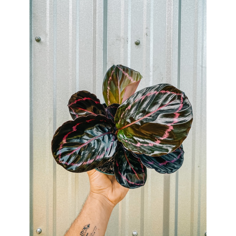 Calathea DottieCalathea Dottie is a striking prayer plant variety with bold, deep burgundy leaves accented by bright pink midribs and outlines, giving it a dramatic, almost neon look. At night, like other Calatheas, its leaves fold upward, adding movement