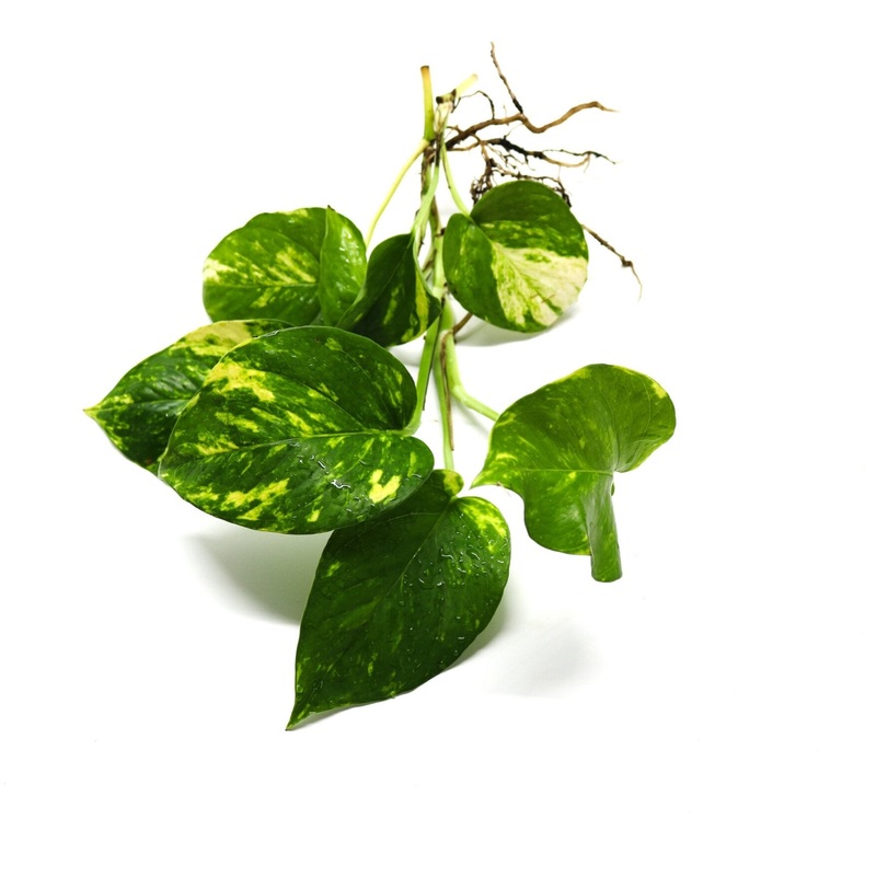 Epipremnum aureum is a moderately small vine with green and yellow variegation. It is a moderate to moderately slow growing species. It does well in moderate, indirect light and moderate to high humidity, and appreciates airflow, but does not require it. Moist sphagnum moss is helpful for rooting this species.