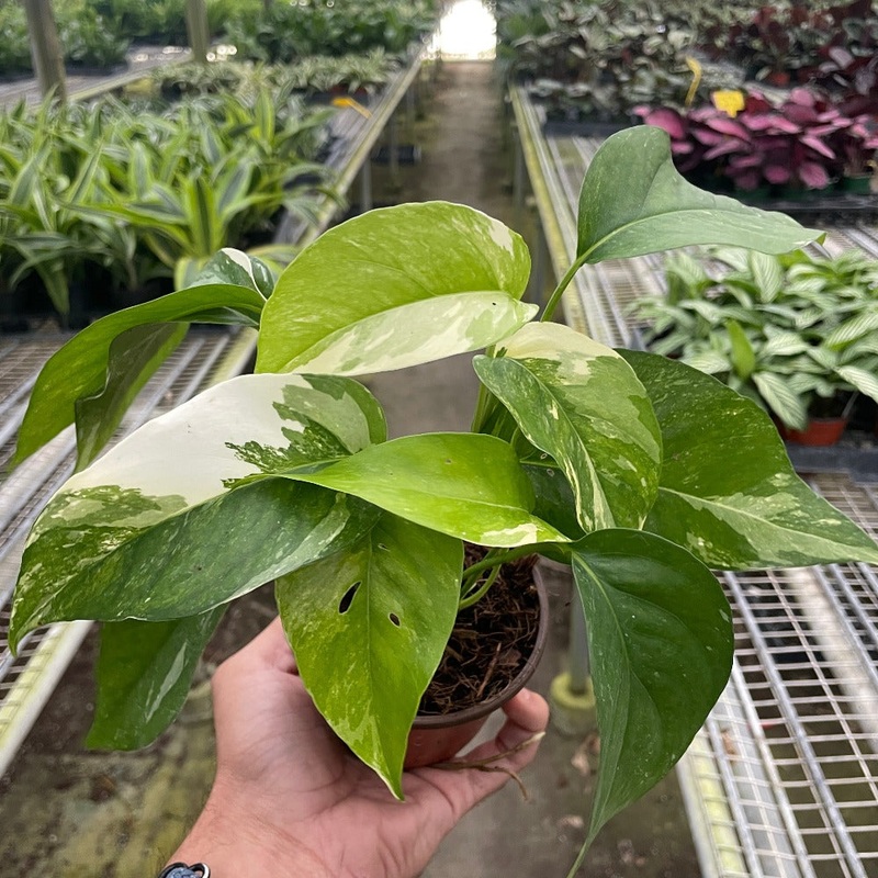 Description: One of the rarest pothos, White Variegated Epipremnum Albo- Variegata showcases creamy whites and lush greens that create a truly breathtaking houseplant. The juvenile leaves are narrow and oval-shaped, but as the plant matures and the leaves become larger and fenestrated so it looks somewhat similar to White Monstera. Provide a moss pole or trellis for the plant to climb and grow in partial sun or bright, indirect light. Fertilize with a dilute solution of balanced fertilizer during the active growing season. Let the top of the soil dry between watering to keep this plant thriving.