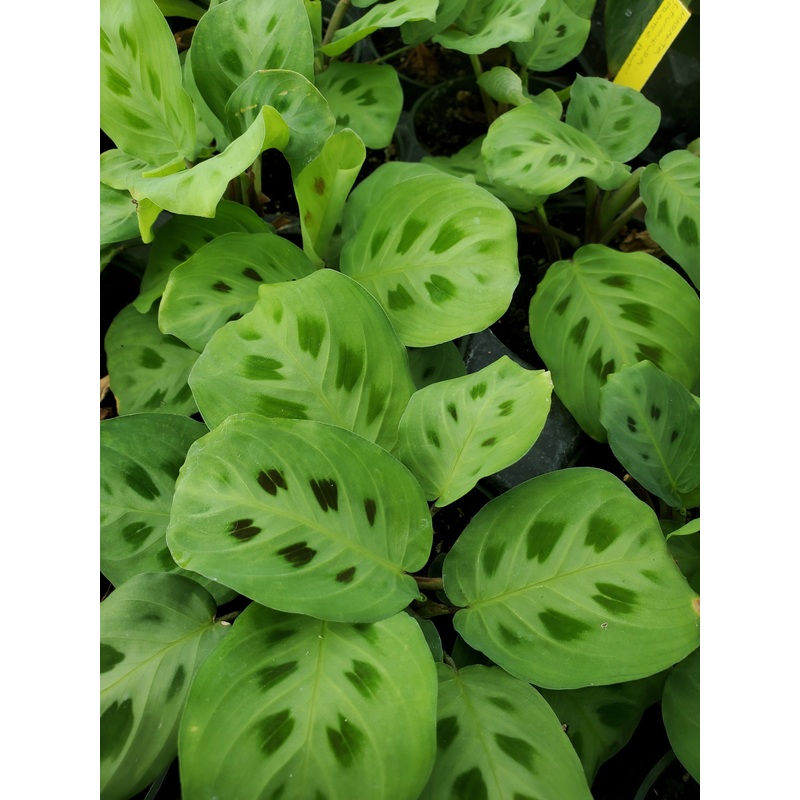 Gorgeous variety sometimes called "rabbit tracks" for the bilateral red spots up each leaf. Brazilian native with the classic nighttime folding behavior of prayer plants. Around 12" tall, slow growing. Let dry pretty well between waterings. Part to full sh