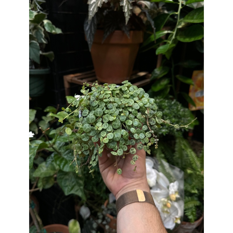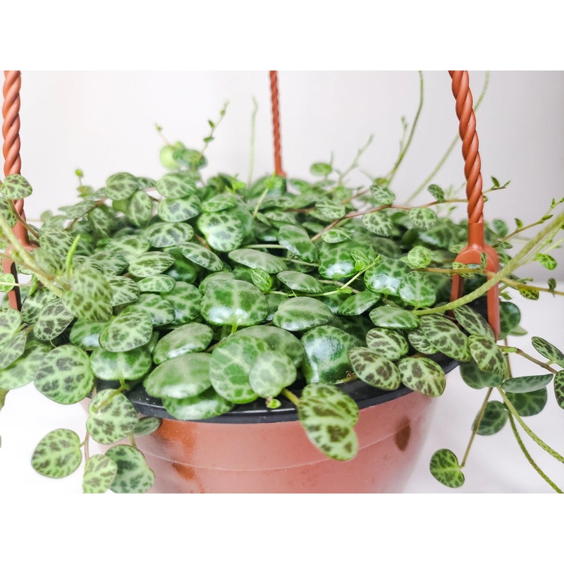 Introducing the stunning Peperomia Prostrata (String of Turtles). With its unique trailing stems, this beautiful plant sports bold rounded bright green leaves resembling tiny turtles. Its slow-growing nature and low maintenance needs make it the perfect addition to any home or office – add a bit of unique charm and character to your space!