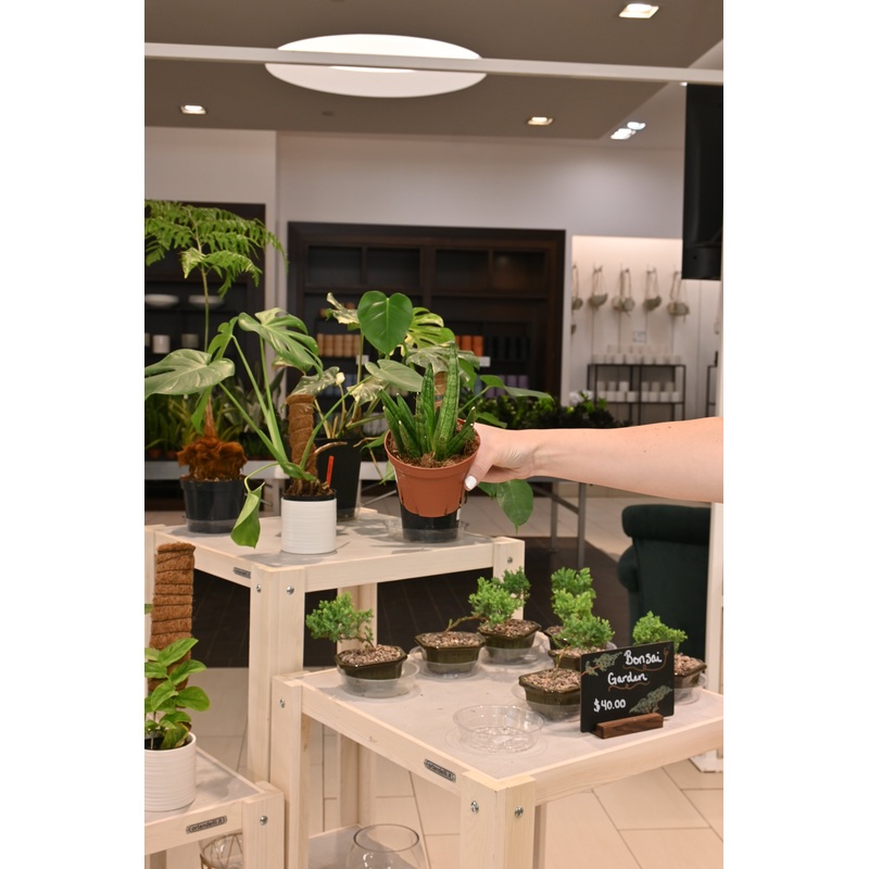 Sansevieria are low-maintenance, and easy-going. They tolerate low light and low humidity. Allow their soil to completely dry out between waterings.